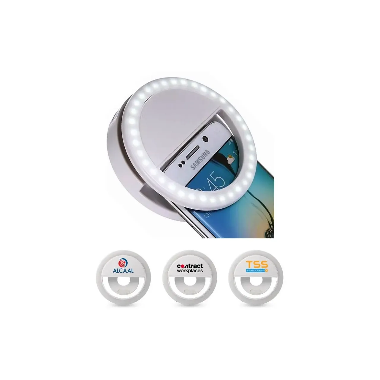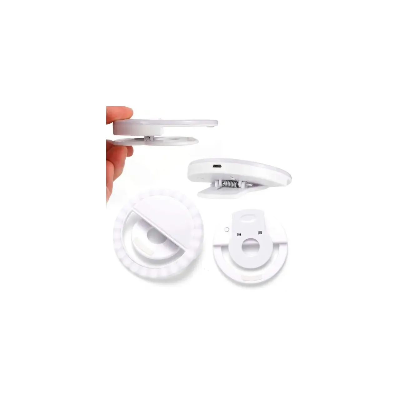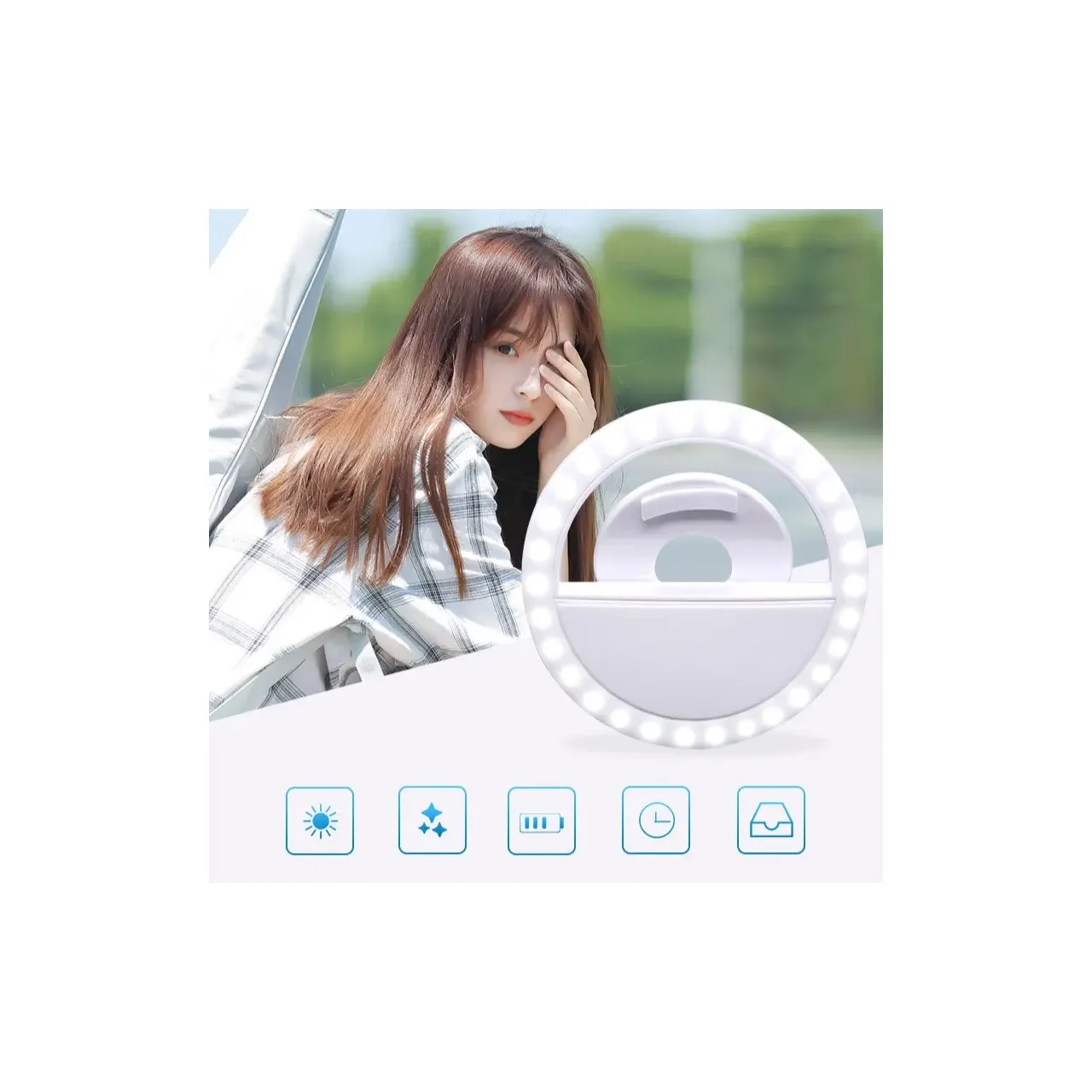 Aro de Luz LED portátil con batería recargable USB, ideal para selfies, videollamadas y streaming. Ofrece 3 niveles de brillo, hasta 5 horas de uso y diseño compacto de solo 42g. Compatible con celulares, tablets y notebooks.