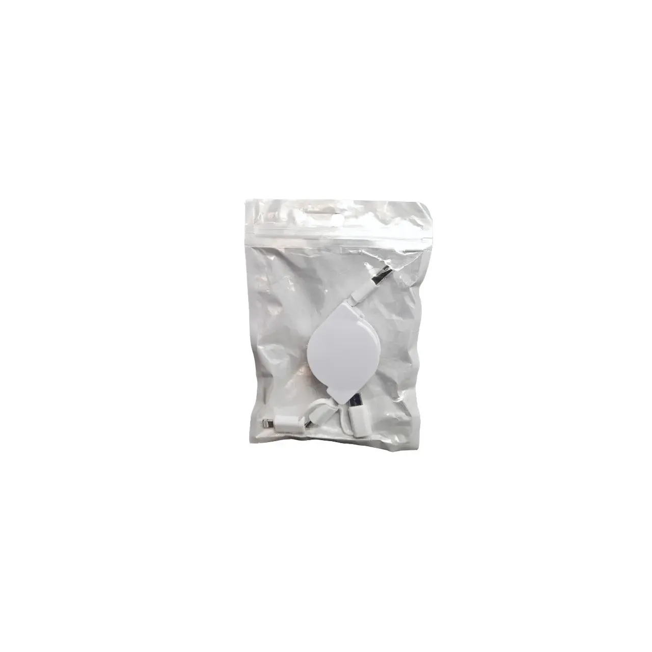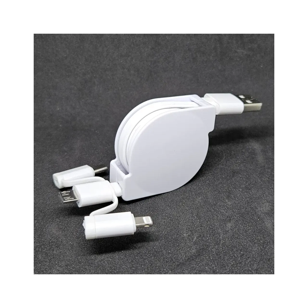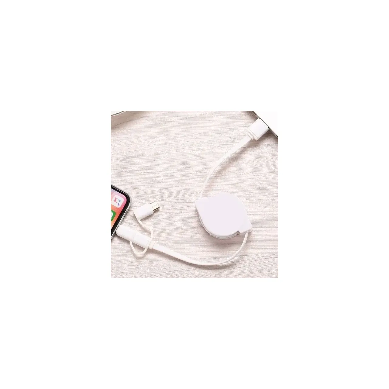Cable retráctil 3 en 1 con carga rápida y diseño reforzado. Compatible con iPhone, Micro USB y USB-C. Compacto, portátil y personalizable con logo. Ideal para uso diario y disponible en blanco y negro.