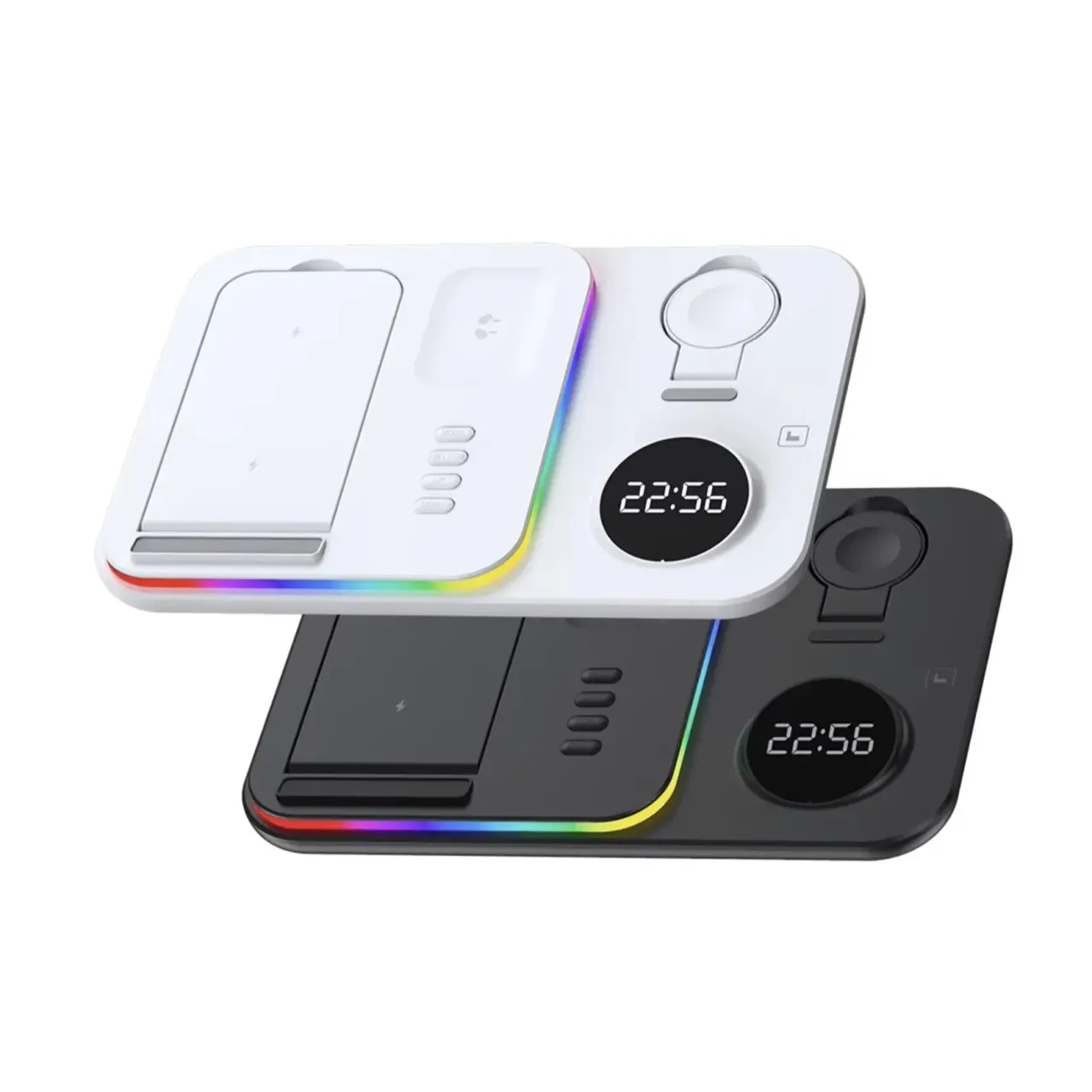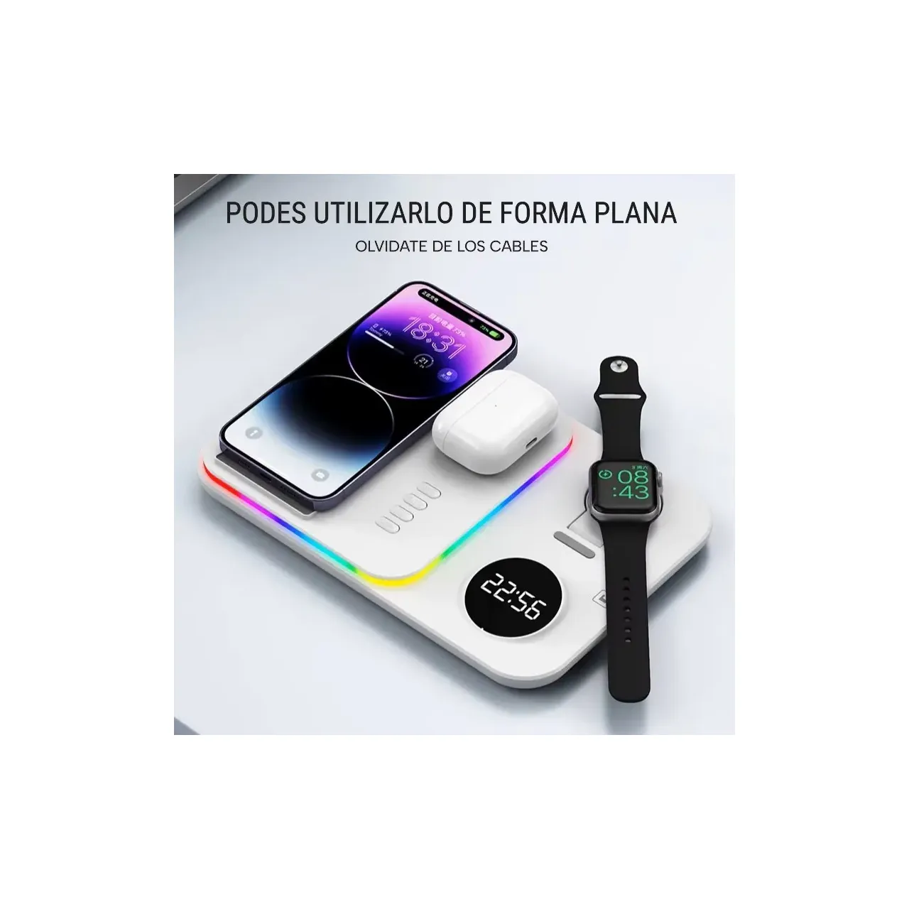 Cargador inalámbrico 5 en 1 con diseño moderno y compacto. Carga simultáneamente tu celular, auriculares y smartwatch, incluye reloj digital, luz RGB ajustable y puerto USB extra. Ideal para mantener tu espacio ordenado y tus dispositivos siempre listos, en casa, la oficina o mientras viajás.