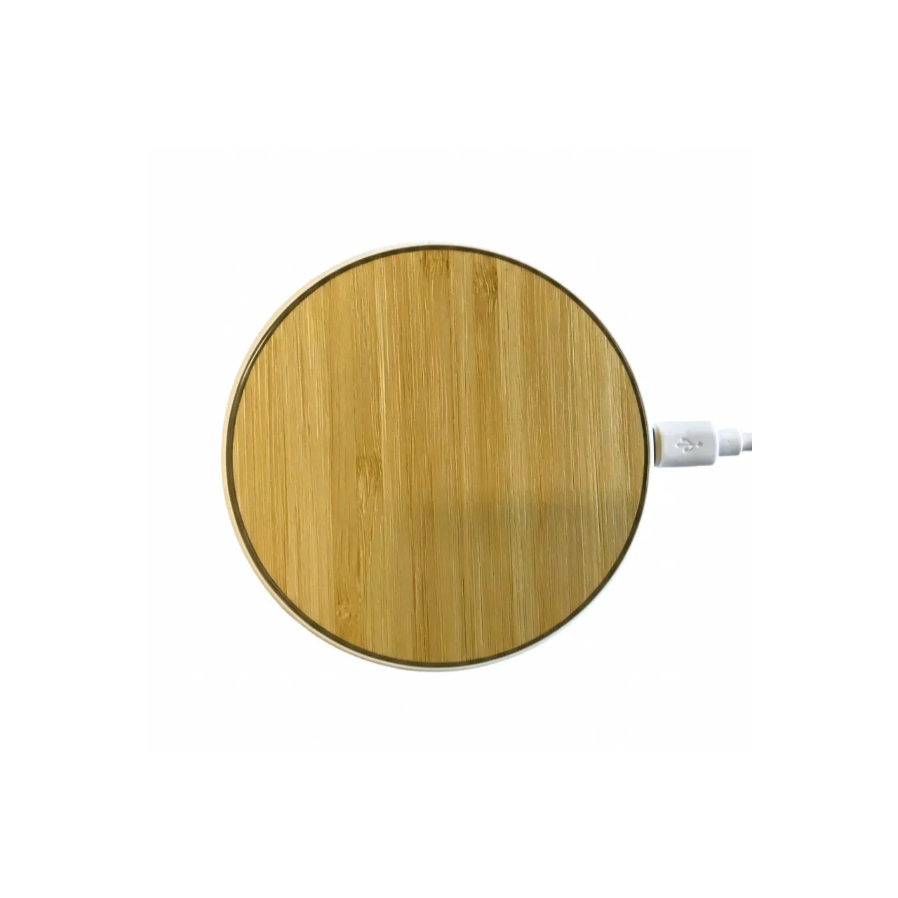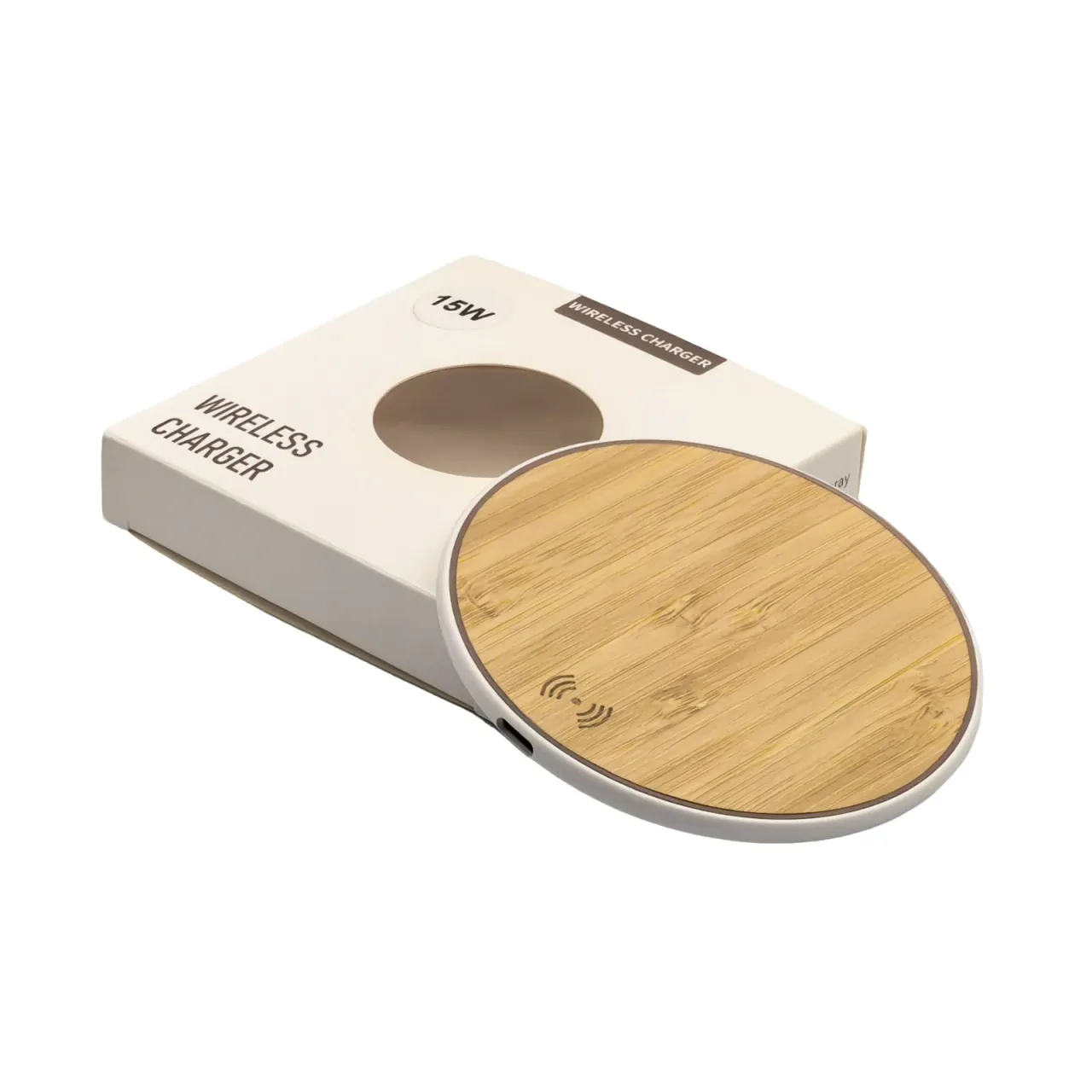Cargador inalámbrico de bambú 15 W, con diseño ecológico y elegante. Fabricado en bambú natural y ABS resistente, combina estilo y funcionalidad. Compatible con todos los dispositivos Qi, incluye cable USB-C blanco y luces LED indicadoras. Ideal para escritorio, oficina o regalos corporativos sustentables.