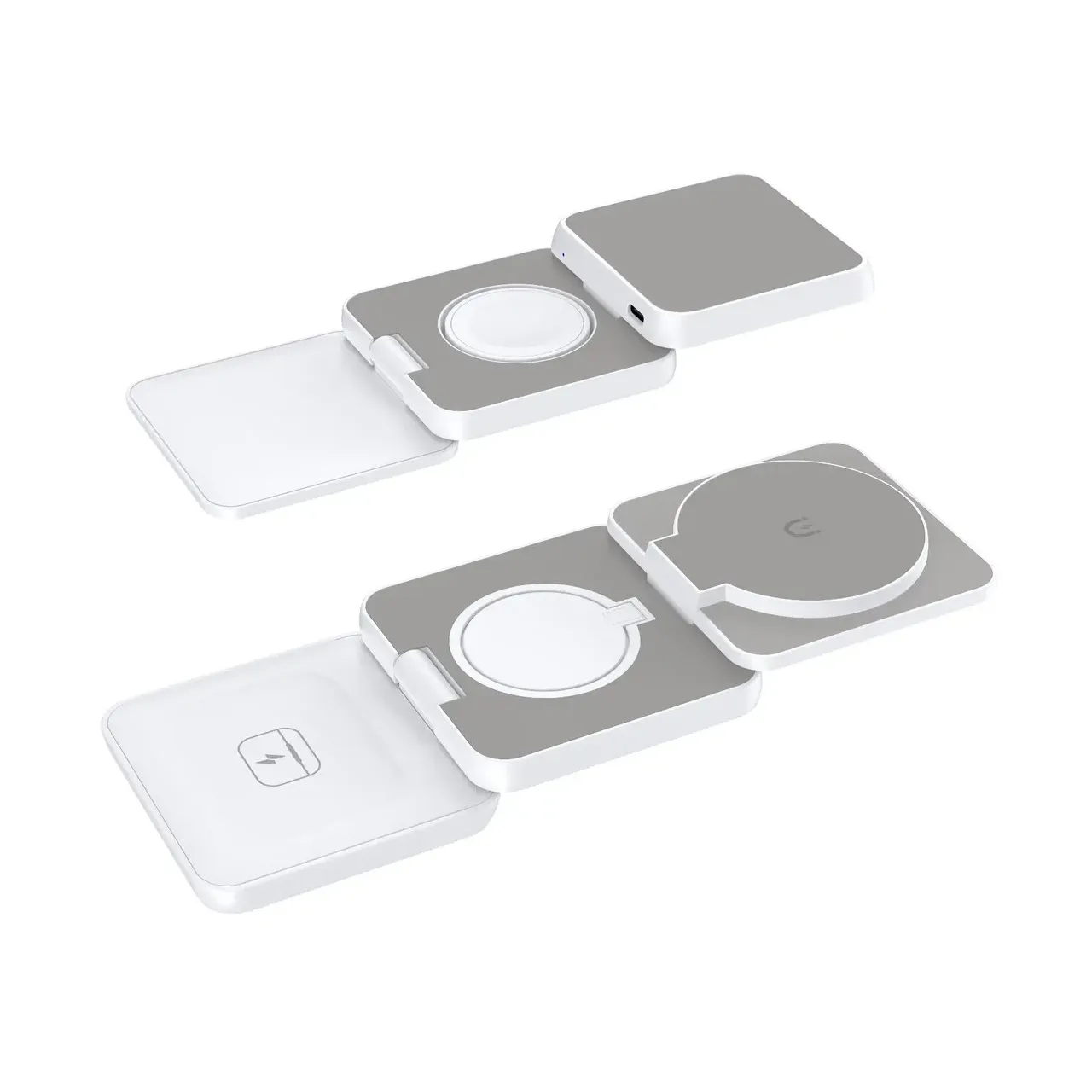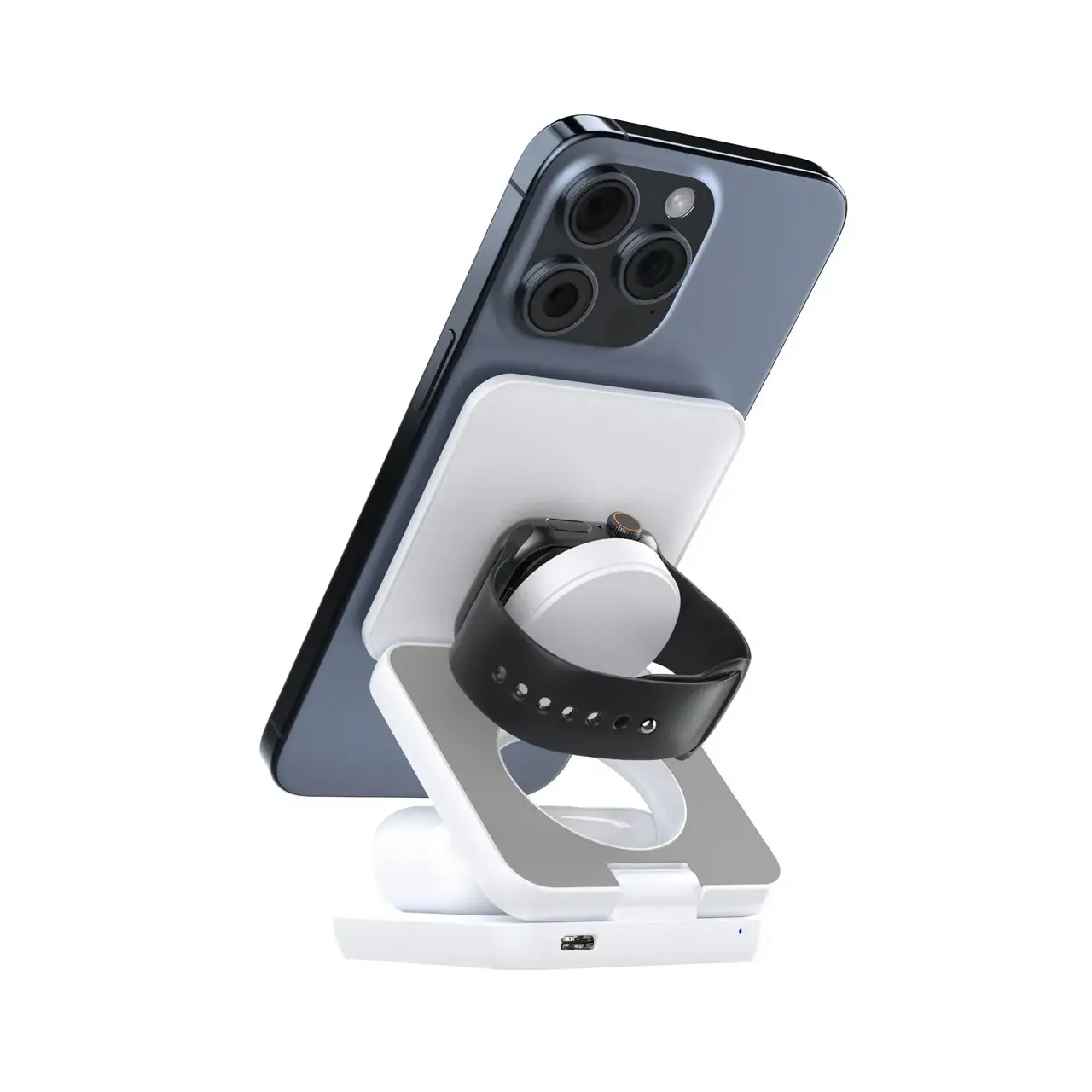 Cargador inalámbrico W900 3 en 1 con carga rápida para celular, auriculares y Apple Watch. Diseño plegable, compacto y magnético, ideal para viajes o escritorio. Incluye cable USB-C y packaging. Eficiencia y comodidad en un solo dispositivo.