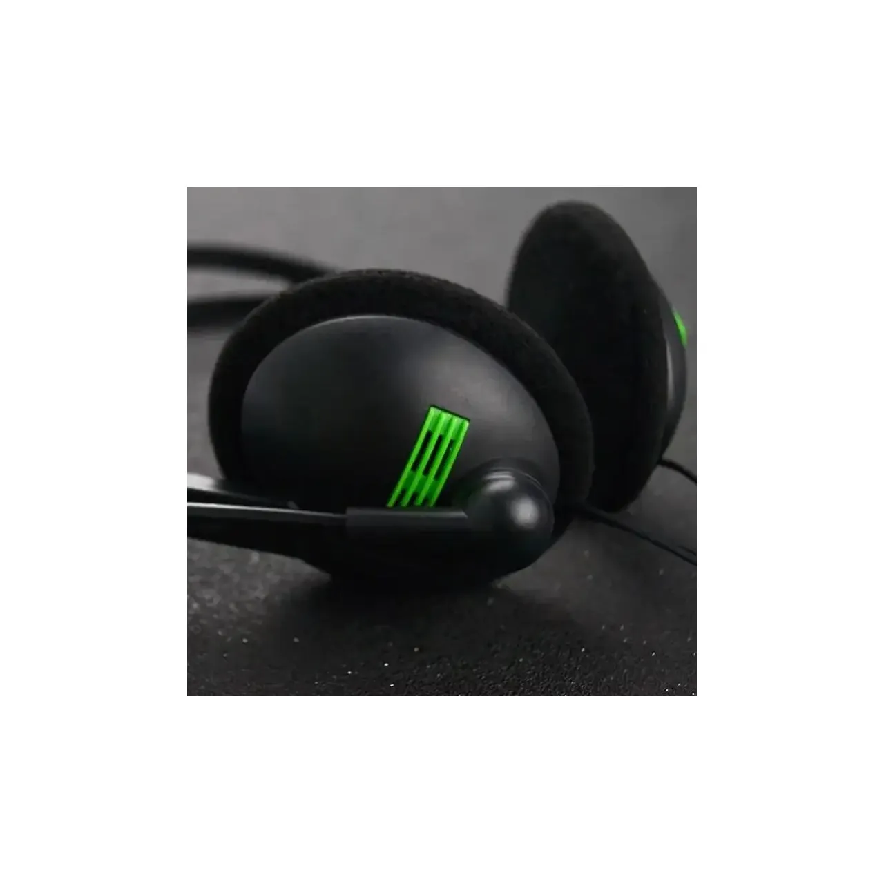 Headset USB con diseño negro y detalles verdes, ideal para música, videollamadas o gaming. Sonido claro con micrófono incorporado, cable de 1.8 m y control de volumen. Cómodo, moderno y compatible con múltiples dispositivos.