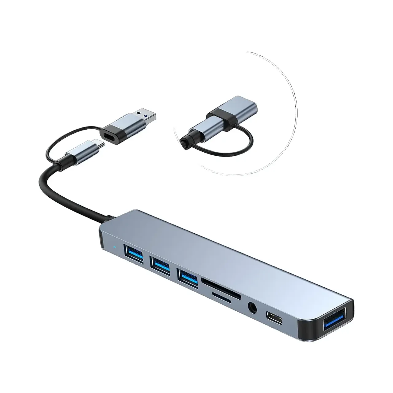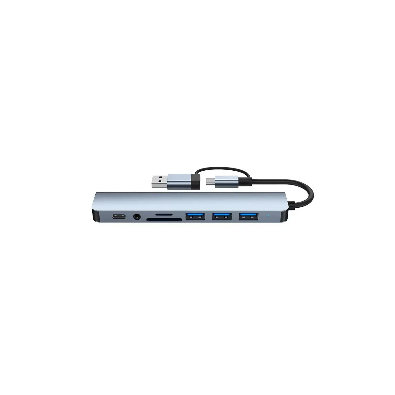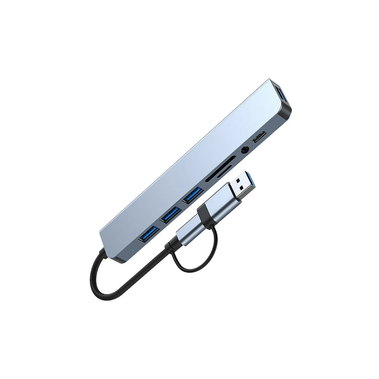 Hub USB – USB-C 8 en 1 Slim con puertos USB 3.0, 2.0, lector SD/TF, Entrada Audio y USB-C OTG. Diseño compacto de aluminio, 13,8 × 2,8 × 1 cm. Ideal para notebooks, tablets y oficina portátil.