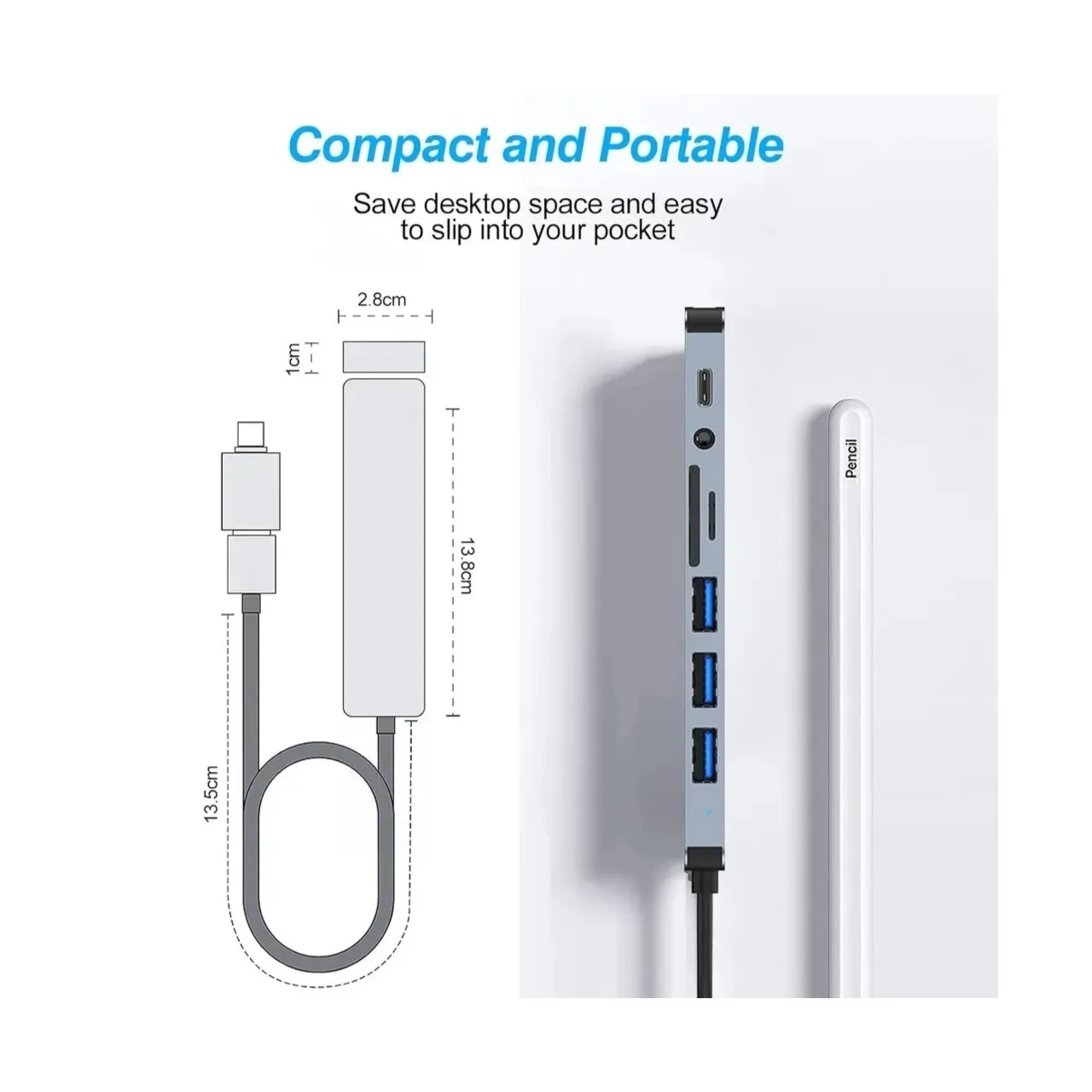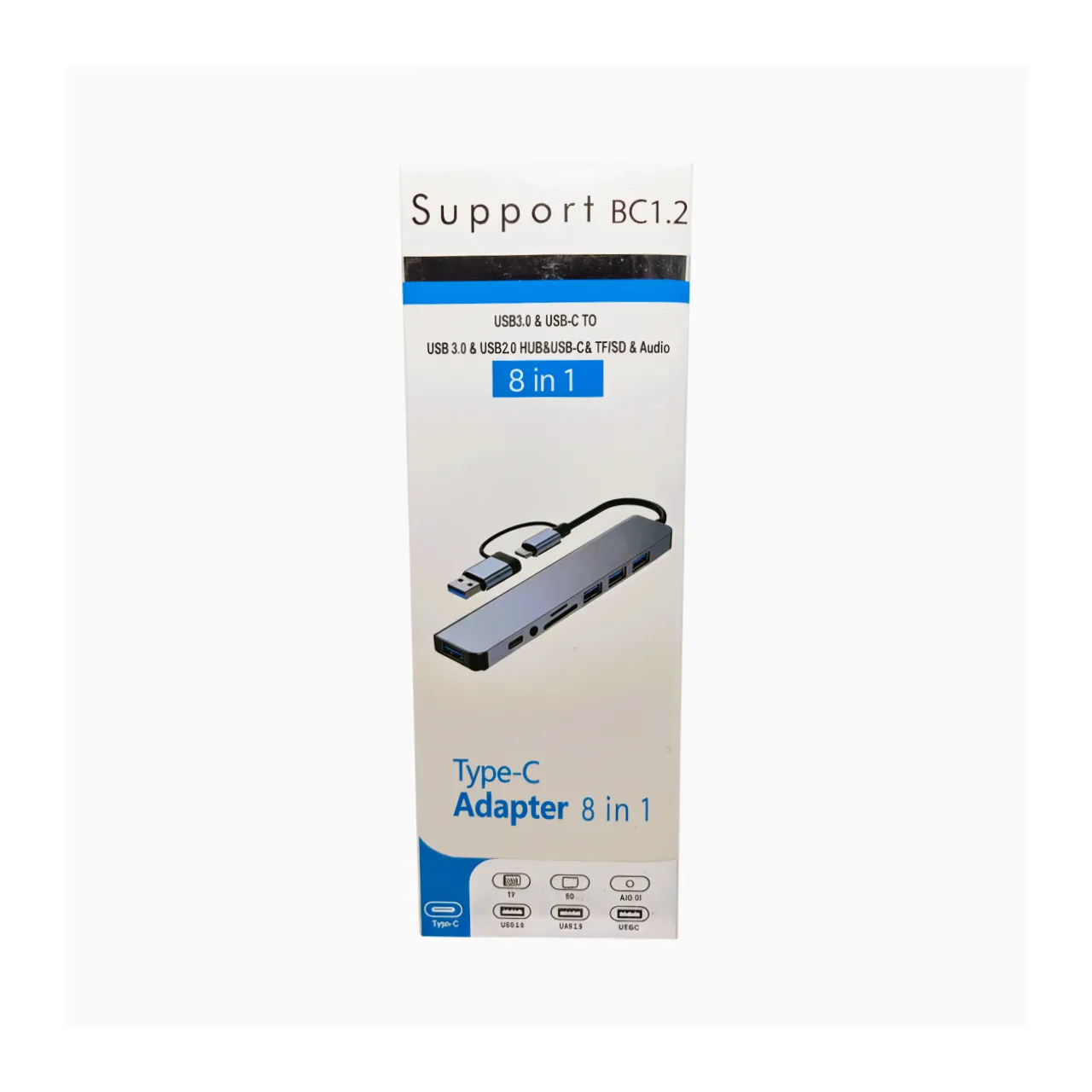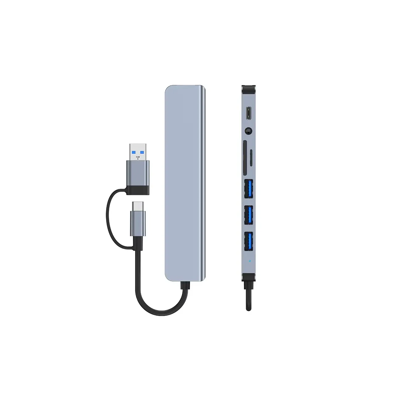 Hub USB – USB-C 8 en 1 Slim con puertos USB 3.0, 2.0, lector SD/TF, Entrada Audio y USB-C OTG. Diseño compacto de aluminio, 13,8 × 2,8 × 1 cm. Ideal para notebooks, tablets y oficina portátil.