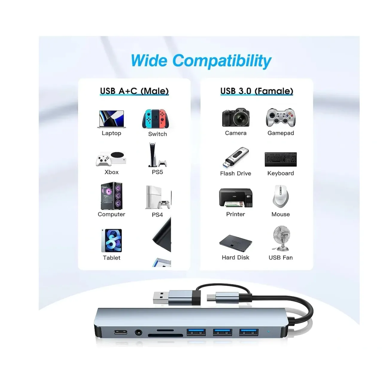 Maximizá la conectividad de tus dispositivos con el Hub USB-C 8 en 1 Slim, un accesorio versátil, elegante y compacto que transforma un solo puerto en una estación completa de expansión.