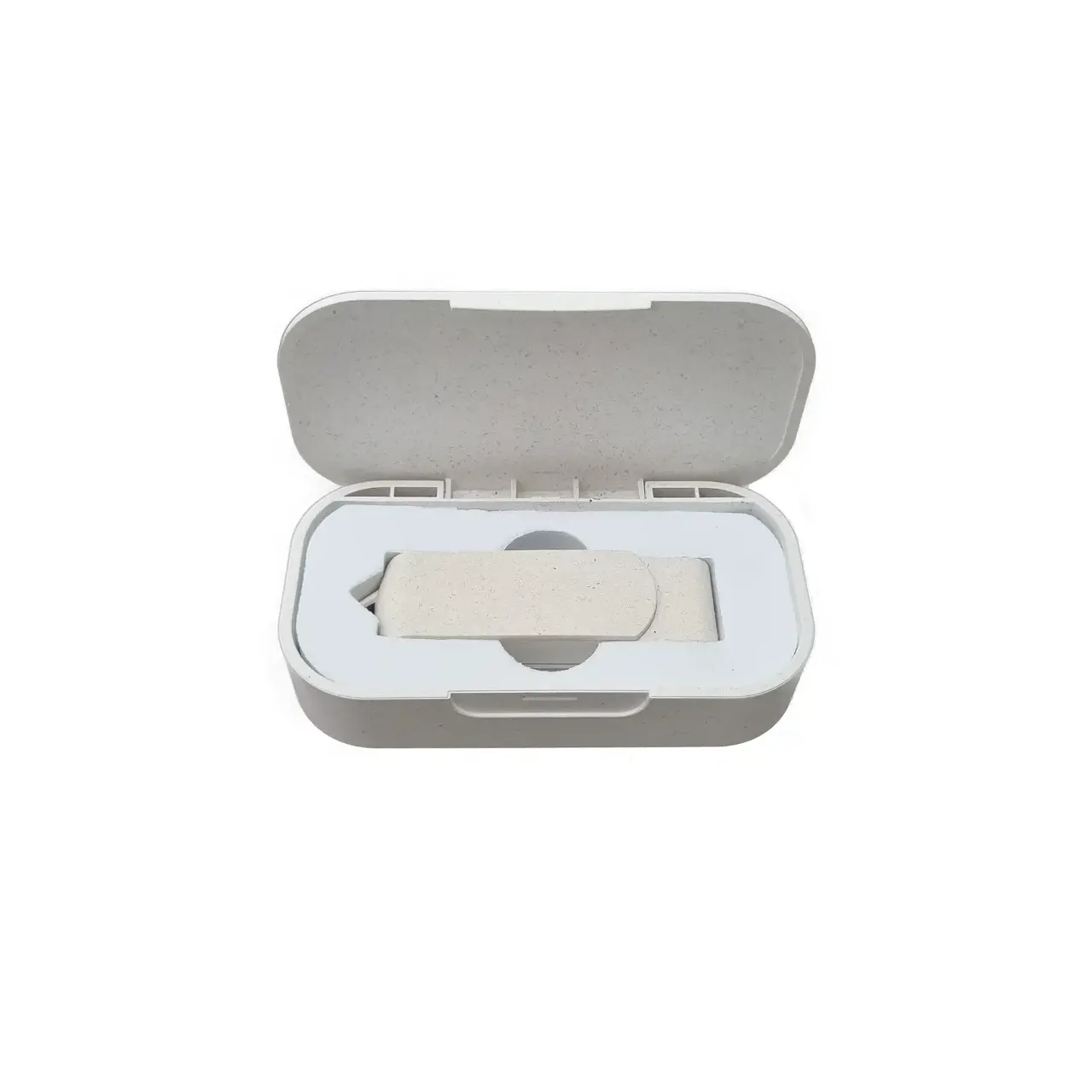 Pen Drive ecológico de 16GB con USB2.0 y memoria Grado A de marcas líderes. Diseño blanco elegante y caja reciclable con base de goma eva. Perfecto para transferir y proteger tus archivos cuidando el medio ambiente.