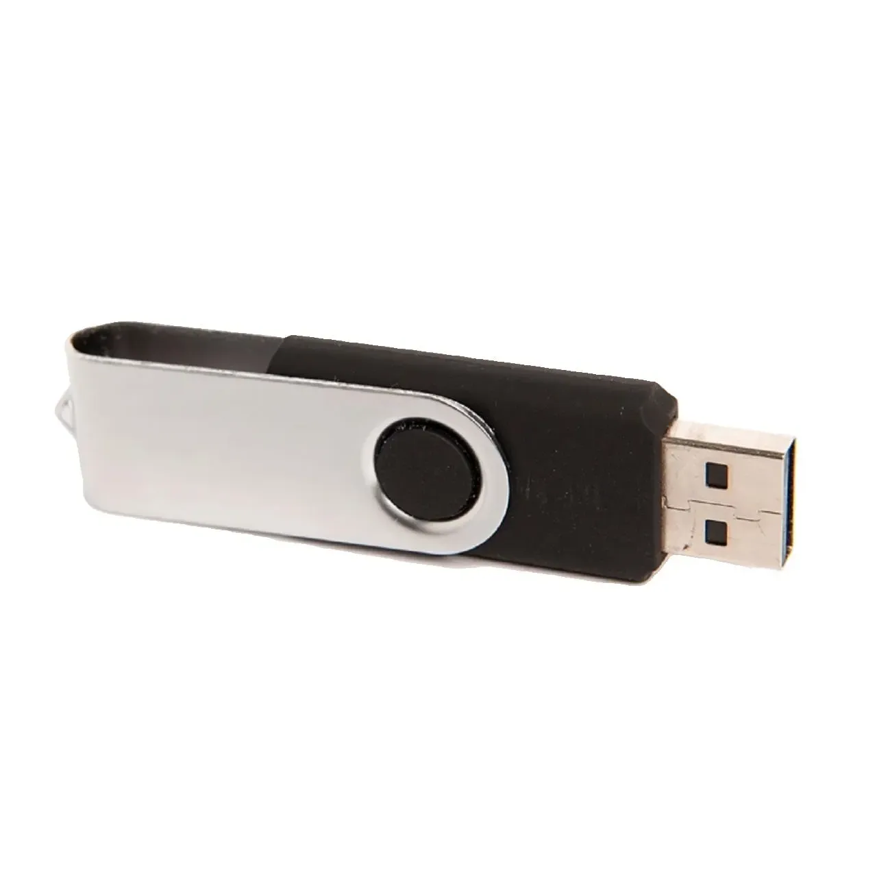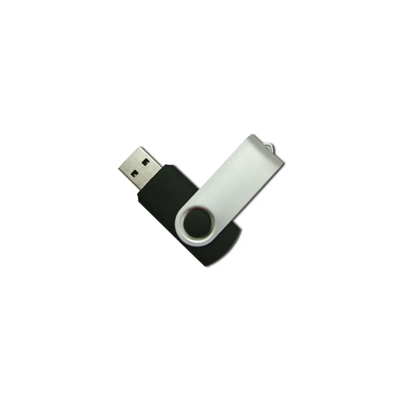 Pen Drive giratorio de 16GB: compacto y elegante con cuerpo negro y tapa metálica plateada. USB 2.0 confiable y memoria Grado A de marcas líderes. Ideal para transportar y proteger tus datos esenciales con estilo y seguridad.