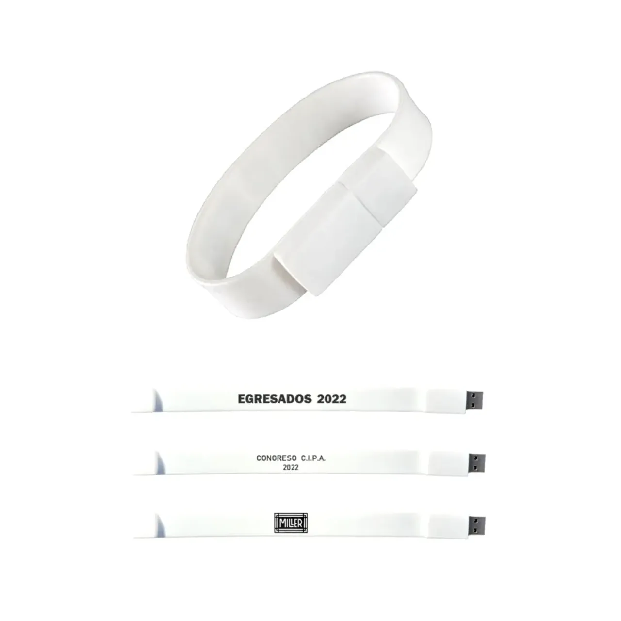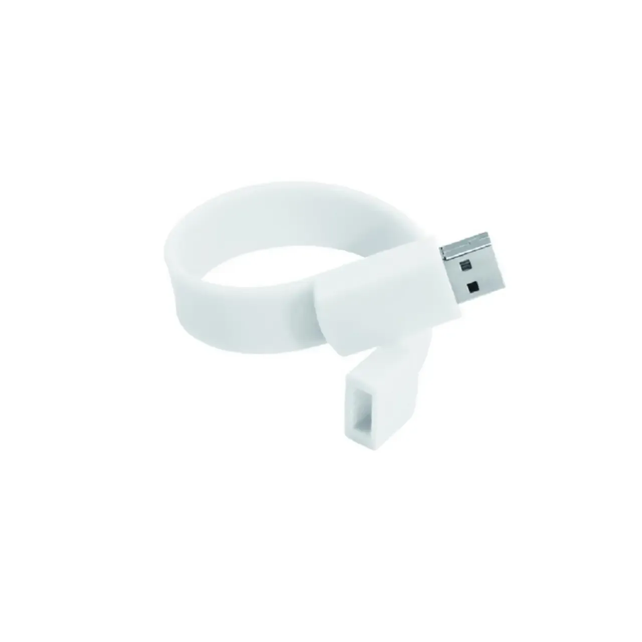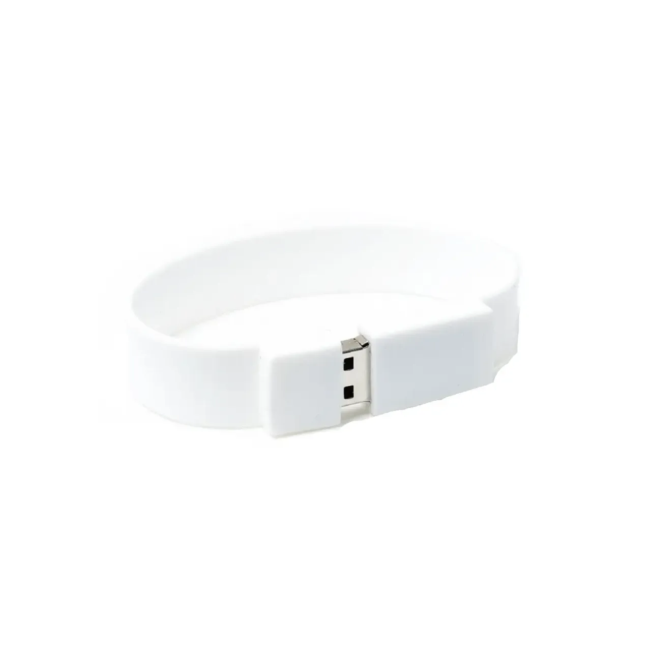 Pen Drive Pulsera de 8GB con diseño moderno y cómodo en color blanco. Conexión USB 2.0 y memoria Grado A para transferencias seguras. Ideal para llevar tus archivos siempre con vos, con estilo y practicidad.