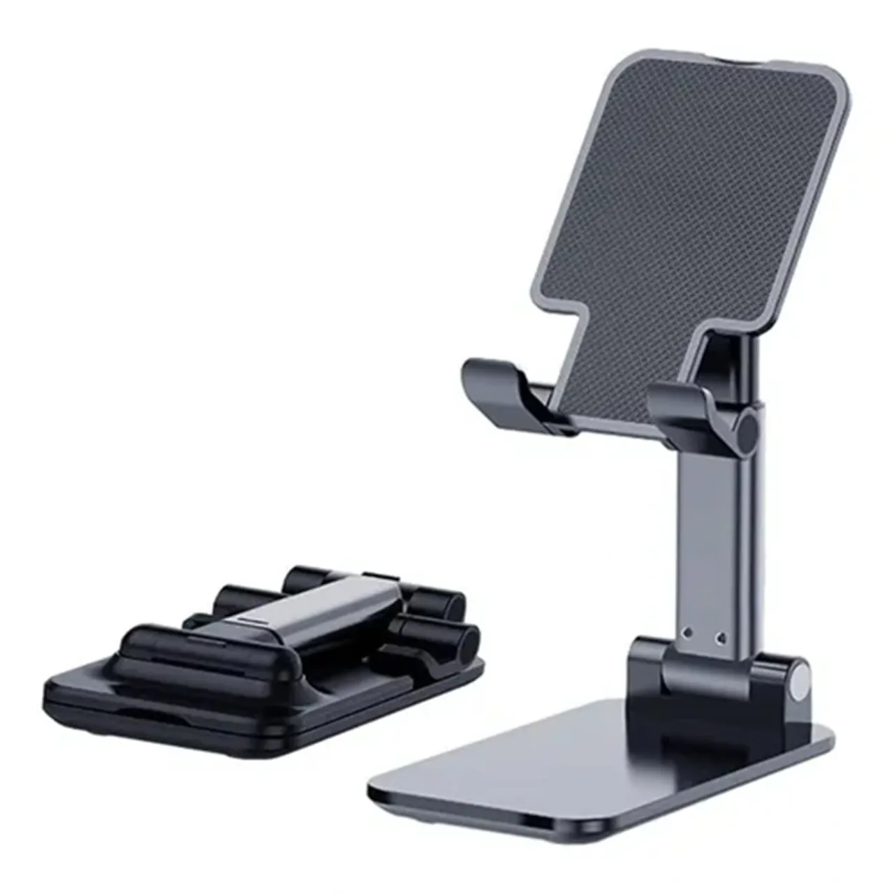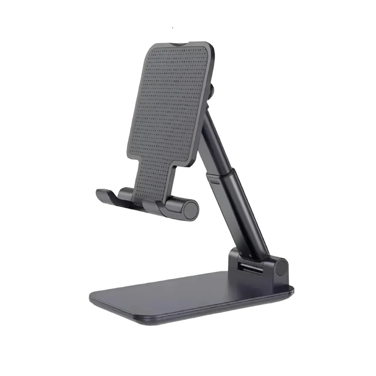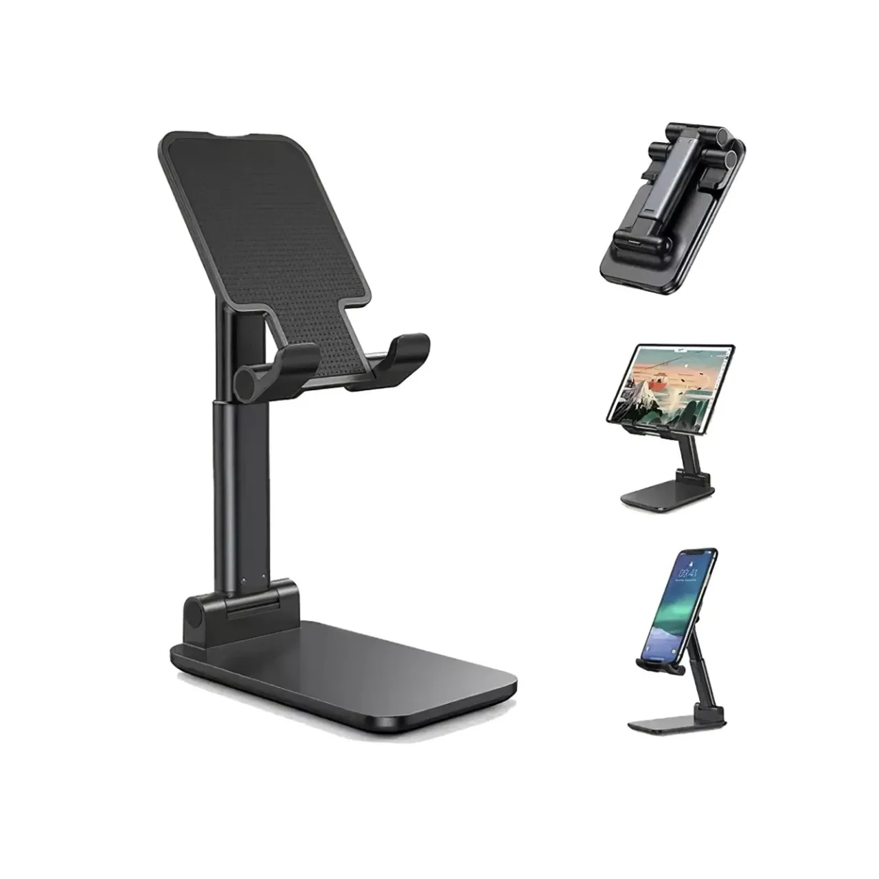 Soporte plegable de escritorio para celular y tablet, con altura e inclinación regulables que permiten una posición cómoda y ergonómica. Su base antideslizante y estructura reforzada brindan gran estabilidad, mientras que su diseño compacto lo hace ideal para videollamadas, oficina, estudio o viajes.