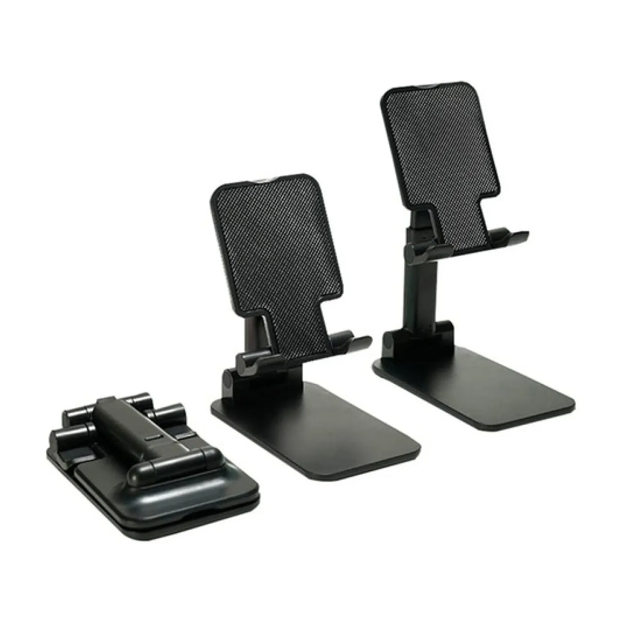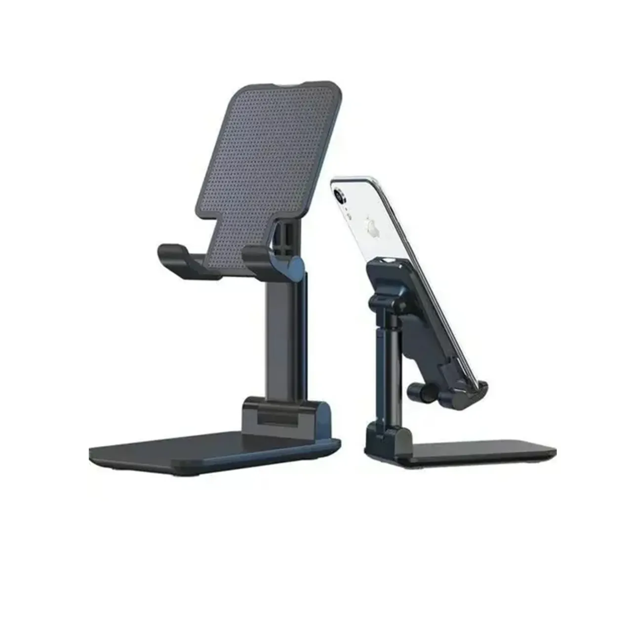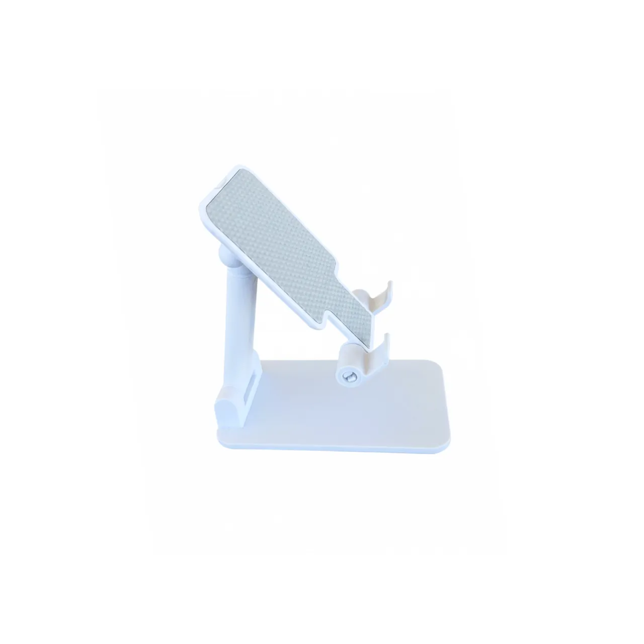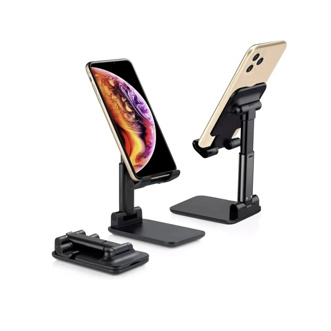 Soporte plegable de escritorio para celular y tablet, con altura e inclinación regulables que permiten una posición cómoda y ergonómica. Su base antideslizante y estructura reforzada brindan gran estabilidad, mientras que su diseño compacto lo hace ideal para videollamadas, oficina, estudio o viajes.