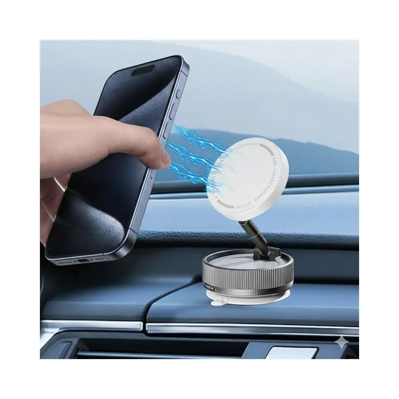 Fabricado con materiales plástico y ABS de alta resistencia, combina durabilidad y ligereza, garantizando un uso prolongado. Su rotación de 360° te permite ajustar el ángulo de visión fácilmente, mientras que el potente imán integrado mantiene el teléfono firme y estable, incluso en movimiento o vibraciones del vehículo.