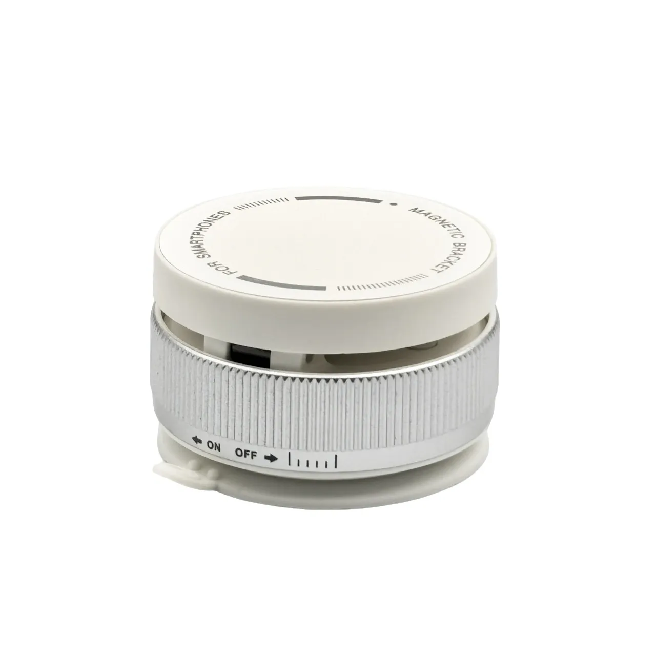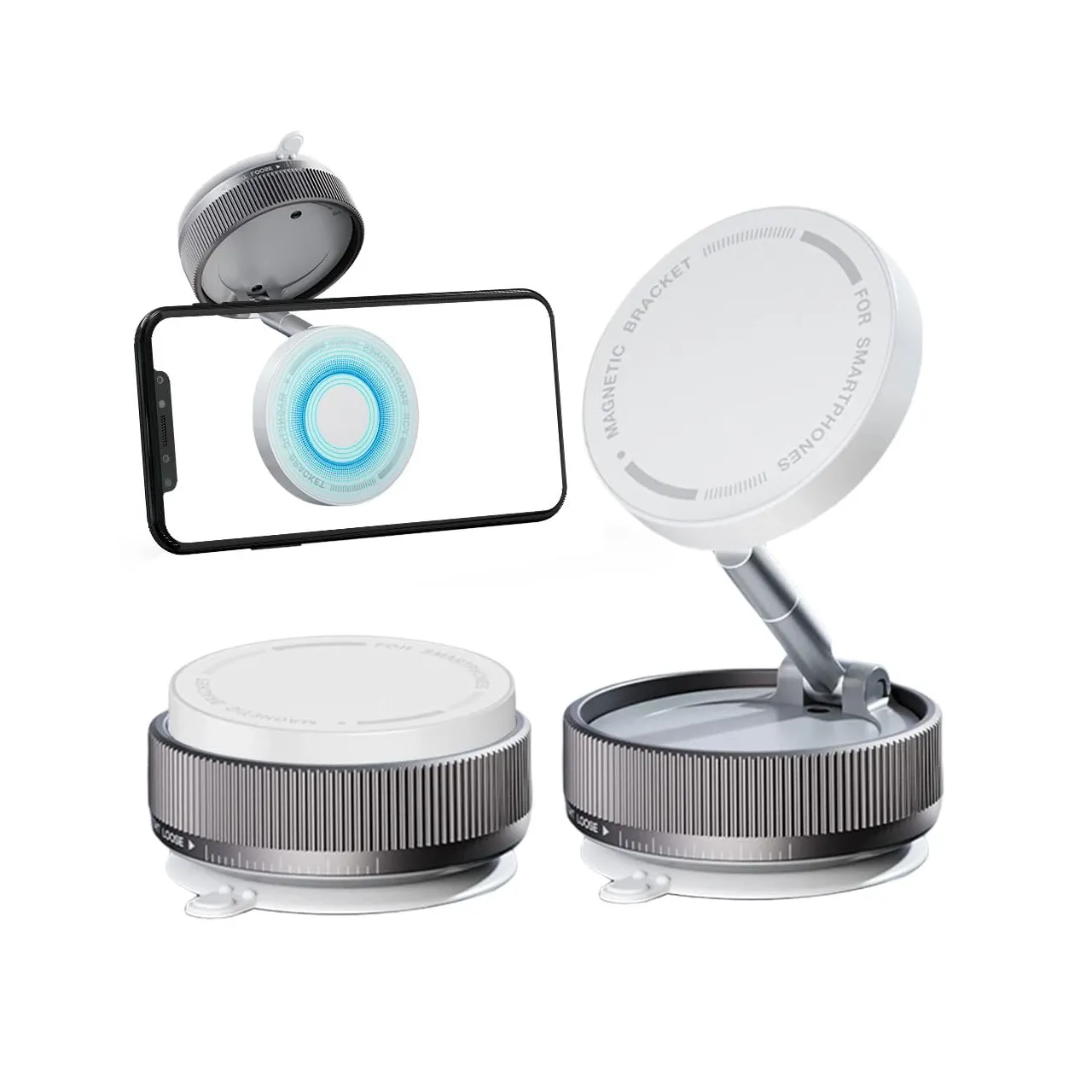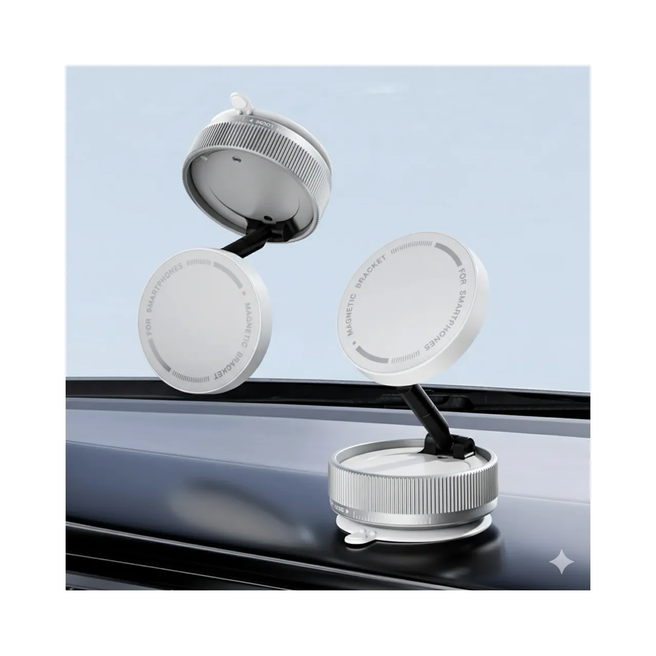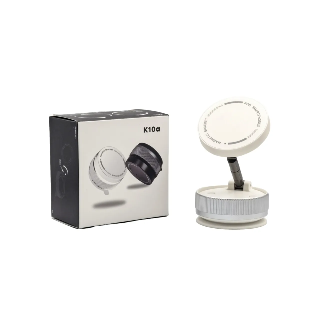 Soporte magnético universal blanco con base a succión y rotación 360°. Ideal para auto, escritorio o pared. Incluye imán, y kit de limpieza. Medidas 3.4 × 6.6 cm.